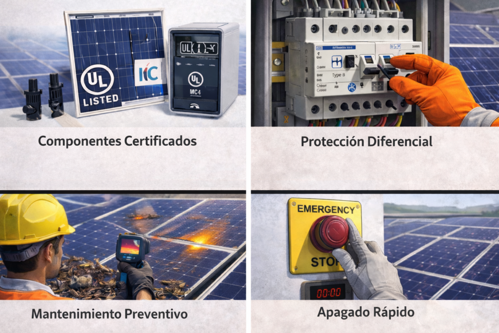 En la industria, sumamos el control de la vegetación (césped corto o grava) y el uso de detectores de arco (AFCI) que cortan el circuito ante cualquier anomalía.